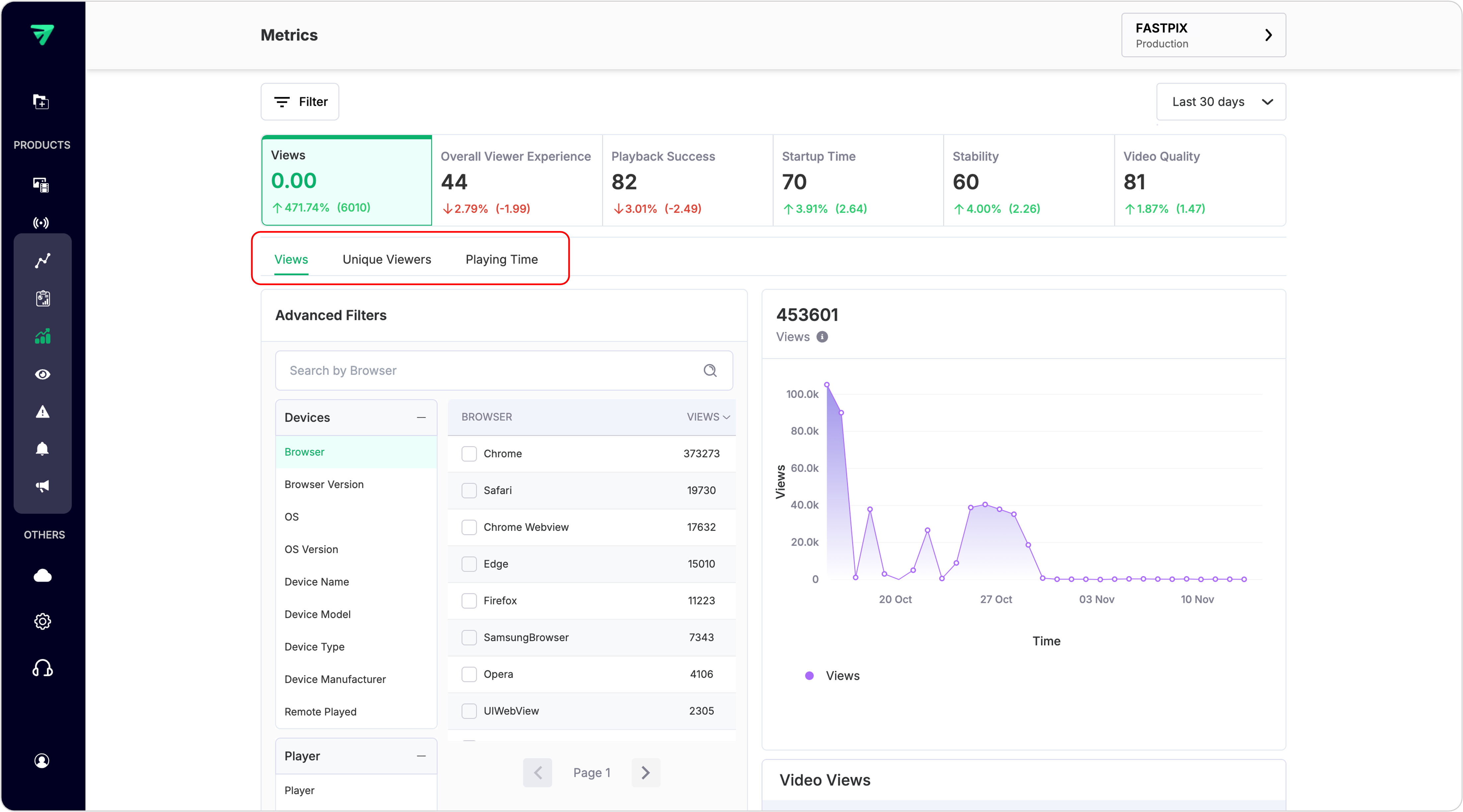 Views metric represents the cumulative count of all video view sessions initiated within a specified time frame. This is helpful for even real-time tracking to see total views including active view sessions.